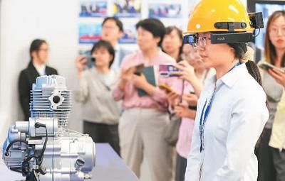 江苏省苏州市以半导体及集成电路、新能源、智能车联网、人工智能、纳米新材料、光子等领域为重点,构建由10个产业集群和30条产业链组成的“1030”产业体系,加快发展新质生产力。图为6月1日,在苏州市昆山元宇宙产业园内的亮风台(昆山)信息科技有限公司,工作人员演示AR智能穿戴设备赋能工业应用的场景。