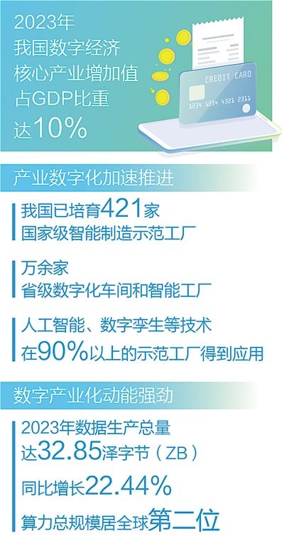 2023年我国数字经济核心产业增加值占GDP比重达10%。“当前我国数字经济发展呈现出良好的态势,数字经济核心产业增加值占GDP比重也在逐年攀升。”中国电子首席科学家、中国电子云总工程师朱国平说,随着数字基础设施建设不断扩容提速,以及“人工智能+”“数据要素×”相关行动的不断推进,将持续推进数字经济与实体经济深度融合,赋能我国经济社会高质量发展。