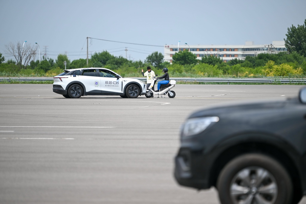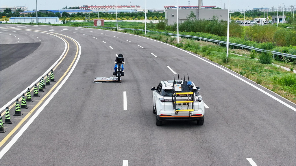 6月14日,在天津(西青)国家级车联网先导区封闭测试场,测试人员准备对一款智能网联汽车进行自动驾驶安全功能测试。
