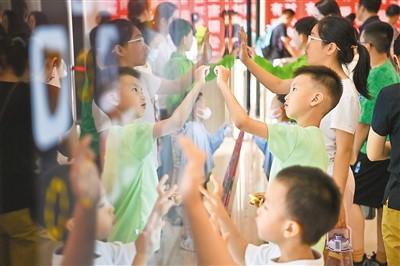 小朋友们在山西自然博物馆电子屏前参与互动小游戏。 |