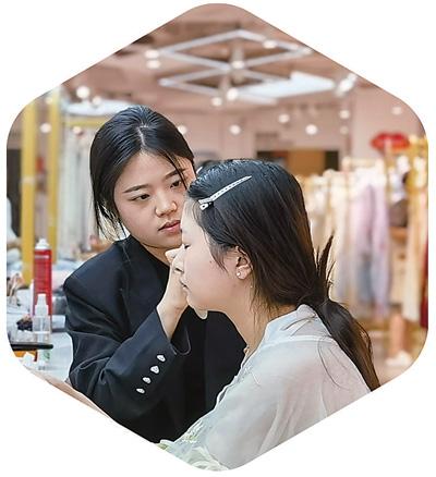 游客在西安“唐潮十三嘟”汉服体验馆大唐不夜城店做造型。 |