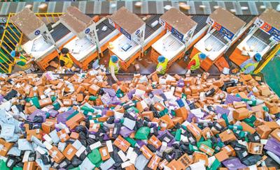 图为江苏省宿迁经济技术开发区邮政邮件处理中心,工作人员在进行分拣。 |