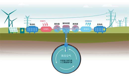 用电高峰时,地下储气库会释放所储存的高压空气、储热罐释放所储存的热量。这时,高压空气被加热,使其具有极大的膨胀力来驱动空气透平发电机组,就像吹动风电机组的“大风车”一样,产生电能向电网供电。