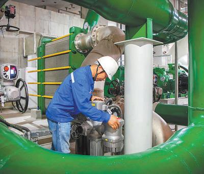 工作人员在压缩空气储能电站调试压缩机闭式冷却水系统阀门。 |