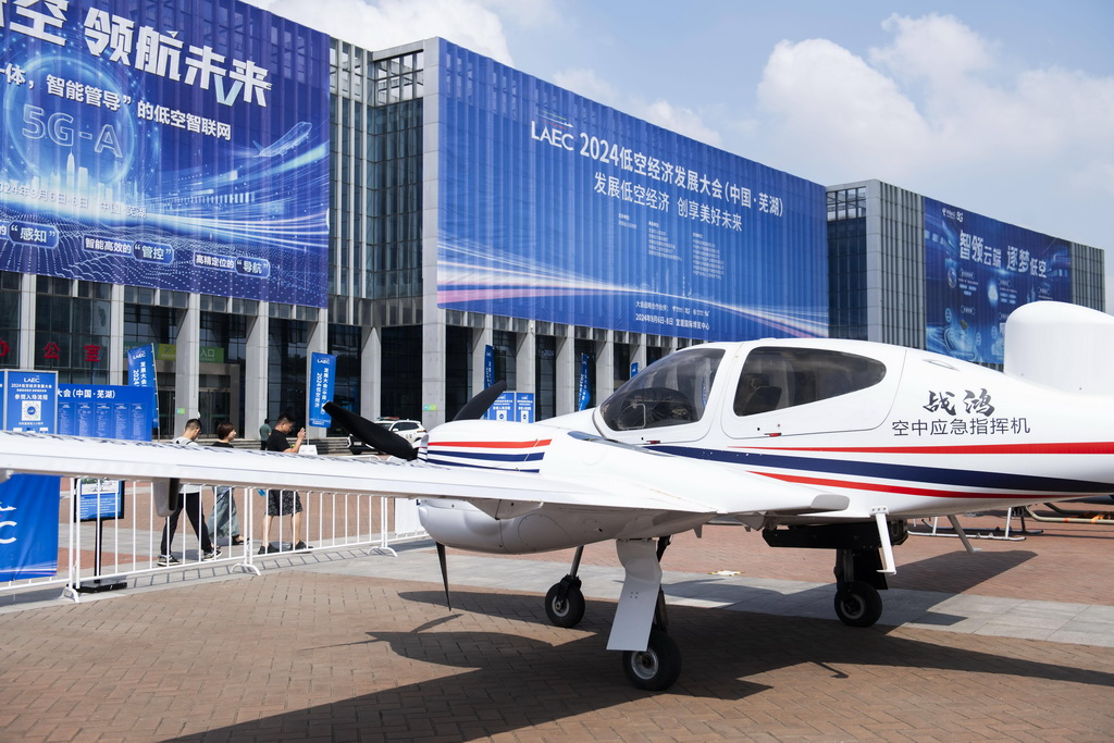 9月6日,观众在2024低空经济发展大会创新成果户外展区了解一款空中应急指挥机。新华社记者 傅天 摄