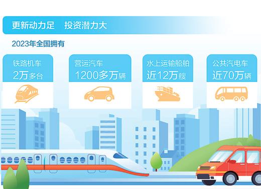 同城市公交车一样,铁路机车、汽车、船舶等都有部分设备需要更新。交通运输大规模设备更新,既能有力促消费,又能有效扩投资,将推动行业本身及上下游产业高质量发展。