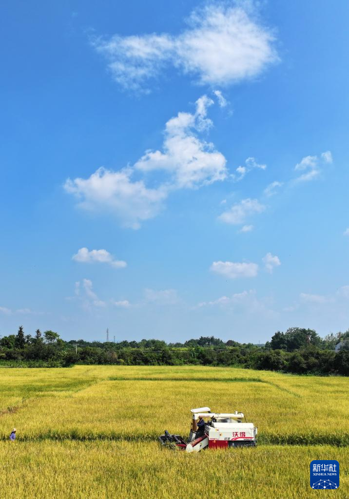 9月18日,在湖南省永州市道县梅花镇贵头村,农机手驾驶农机在收割稻谷(无人机照片)。