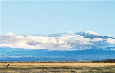 在肯尼亚卡贾多县安博塞利国家公园里拍摄的乞力马扎罗山。安博塞利国家公园位于肯尼亚与坦桑尼亚交界地区,是非洲著名旅游胜地。