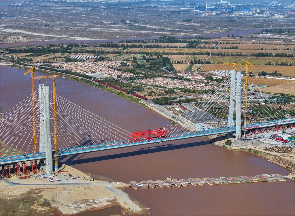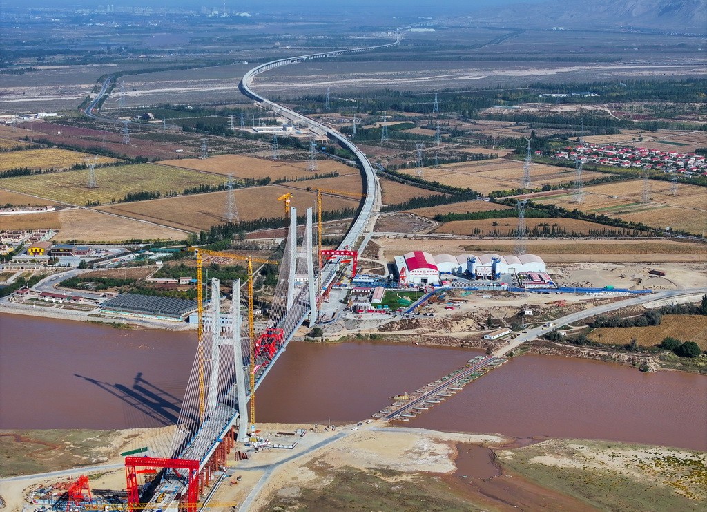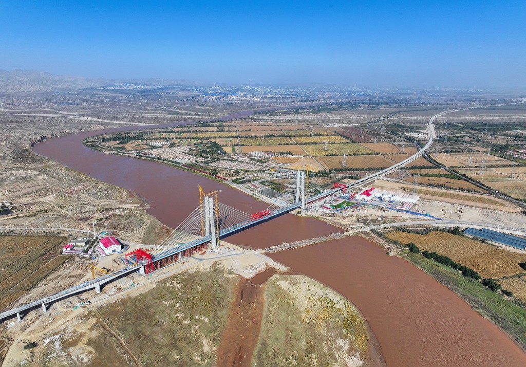 10月9日,包银高铁乌海黄河特大桥顺利合龙贯通,为线路早日建成通车迈出坚实一步。包银高铁是我国“八纵八横”高速铁路网京兰通道的重要组成部分,设计时速250公里,是西北地区连接东北、华北地区的交通大动脉和经济大通道。新华社记者 连振 摄