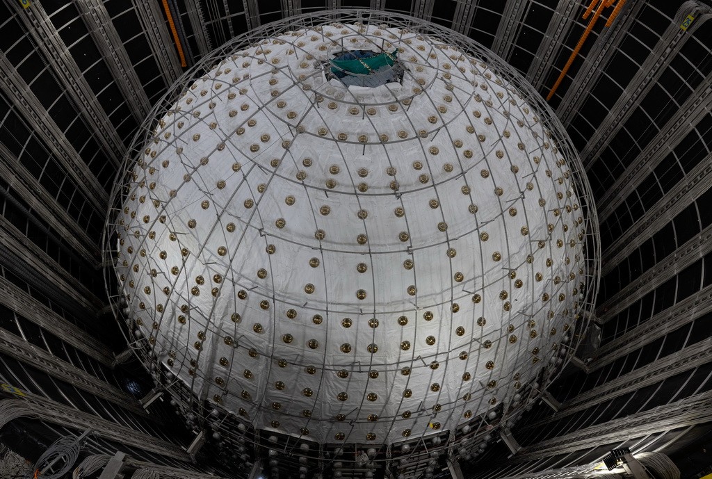 据中国科学院高能物理所消息,江门中微子实验建设目前已经进入收官阶段,最内层的有机玻璃球已合拢,外层的不锈钢网架和光电倍增管也在有序合拢中,预计11月底将完成全部安装任务。江门中微子实验以测量中微子质量顺序为首要科学目标,并进行其他多项重大前沿研究,建成后将成为国际中微子研究中心之一。新华社记者 金立旺 摄