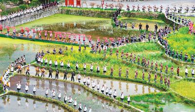 人们在贵州省黔东南苗族侗族自治州黎平县肇兴侗寨的田园中演唱侗族大歌。