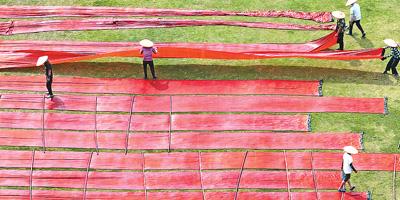 3月26日,广东省佛山市顺德区一香云纱产研文化基地的工人,利用晴好天气抓紧时间晒香云纱。 |