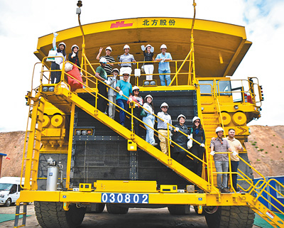 国际青年代表在国能准能集团绿色矿山登上无人驾驶卡车合影留念。