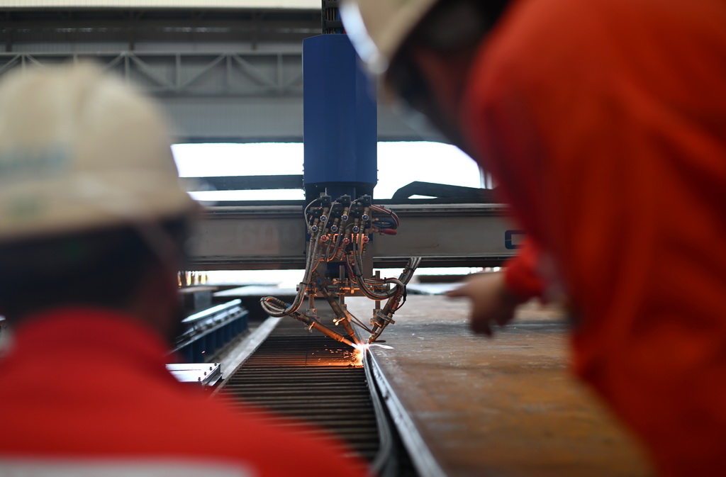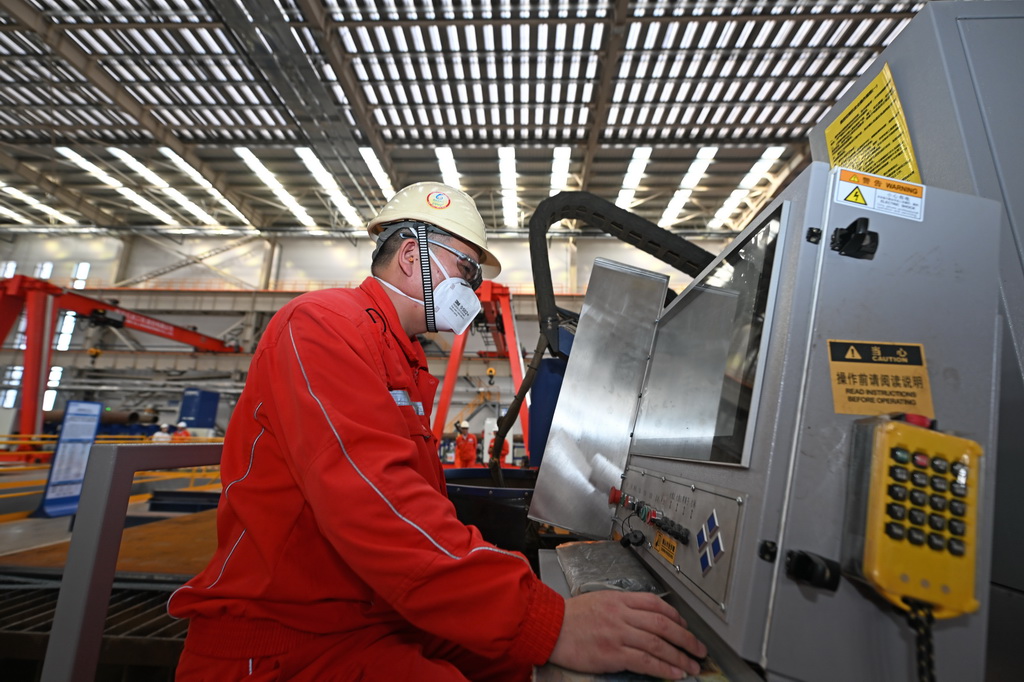 10月30日,工作人员在海油工程天津智能制造基地制管作业车间操作数控切板机。