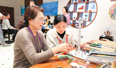 手工艺人(左)在“上海非遗客厅”展示同心结的制作方法。