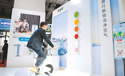 一名男子在进博会消费品展区参与“骑行解锁清洁空气”活动。