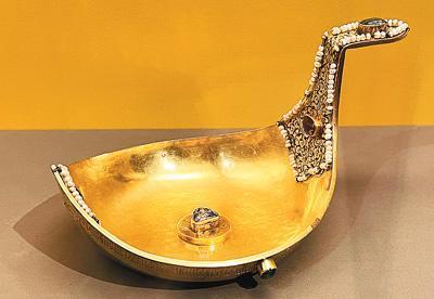船形杯是古代俄罗斯最具特色的容器之一。在宴会上,船形杯被用来盛放最受欢迎的俄罗斯饮料——蜂蜜或蜂蜜酒。展览中有一件1624年的船形杯,由黄金打造,重约1公斤,镶嵌着珍珠和宝石,光彩夺目。