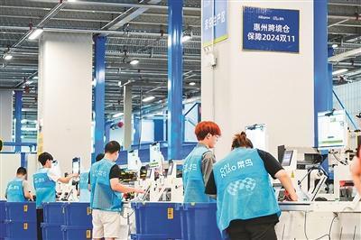 在广东省惠州市,工作人员在菜鸟惠州跨境仓里忙碌。
