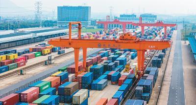 浙江省金华市金东区华东国际联运港,一列中欧班列正在进行110个跨境电商出口货物标箱装车作业,准备从铁路金华南货场启程,运往欧洲。
