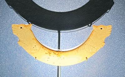 双虎首玉璜两端雕出虎首形,阴刻出鼻、嘴,以两面管钻孔为眼,面部浅浮雕耳、吻部,前肢收于身前呈伏卧状,以阴刻线纹表现虎斑纹理。这件虎头璜造型独特,形象逼真,萌态可掬。