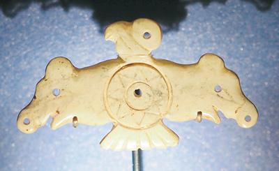玉鹰是凌家滩文化最具代表性的器物之一。鹰侧首傲视,双翅张开,翅端各为一猪首形象,可能以猪作为财富的象征。鹰腹刻八角星纹,这种纹样在凌家滩出土的玉版和新石器时代众多陶器上都有出现。这件玉鹰可能是举行祭祀仪式时所用之物,鹰、猪、八角星纹集于一器,体现了先民崇尚万物有灵的宇宙观。