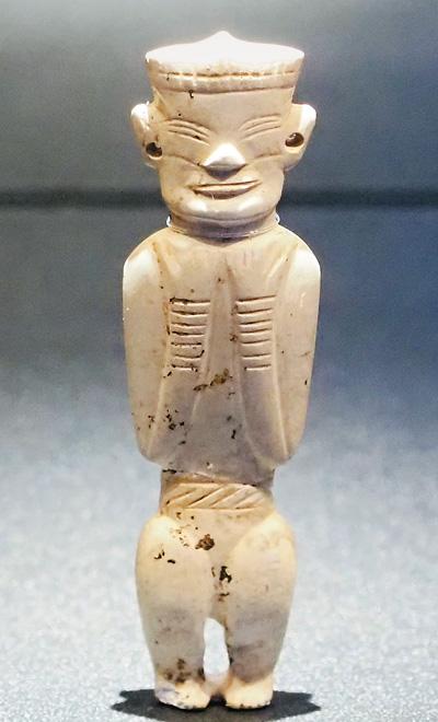 凌家滩遗址出土的玉人头雕像,头戴三瓣叶式冠,额上有3道凸棱,额中部向上略隆起,其下似鼻梁,两眼残存一半,呈椭圆形上挑,与良渚玉器中的神人像颇为相似。