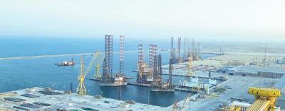 在沙特国王港项目1600吨龙门吊上远眺钻井平台停泊及检修区域。