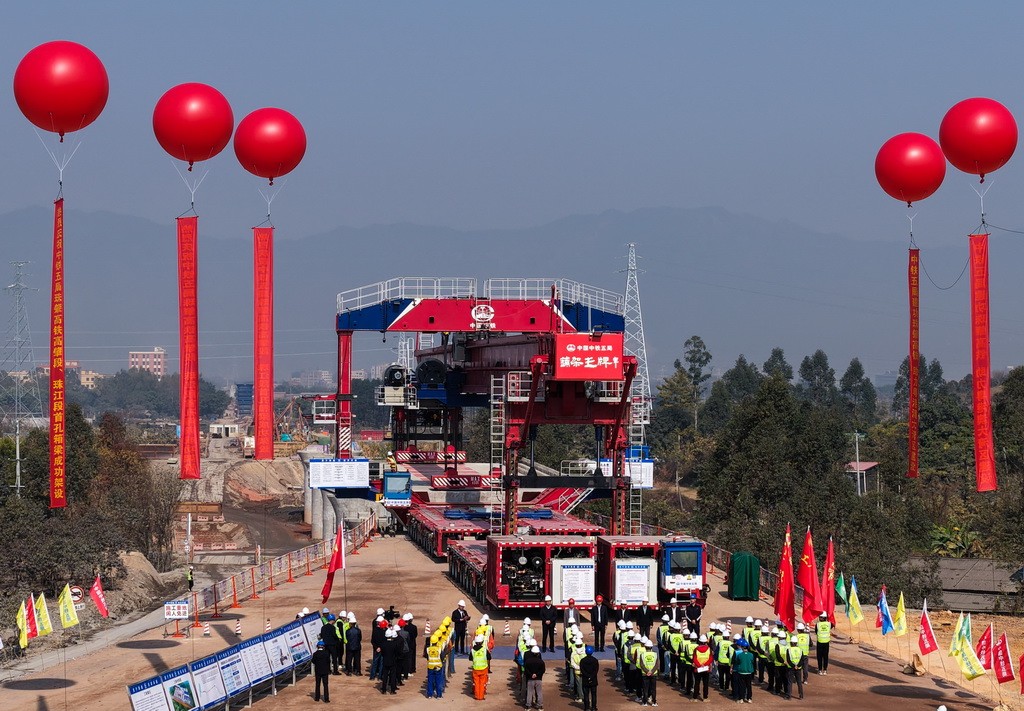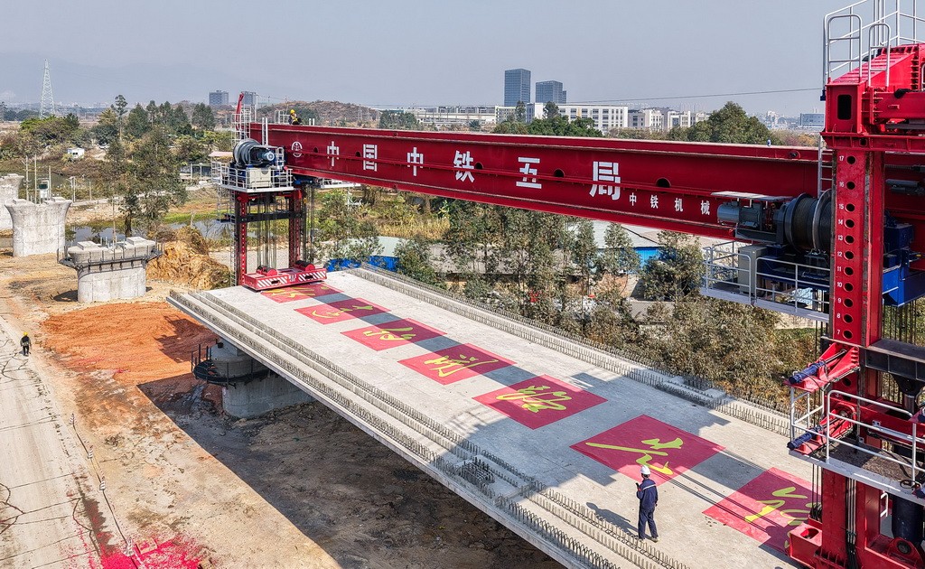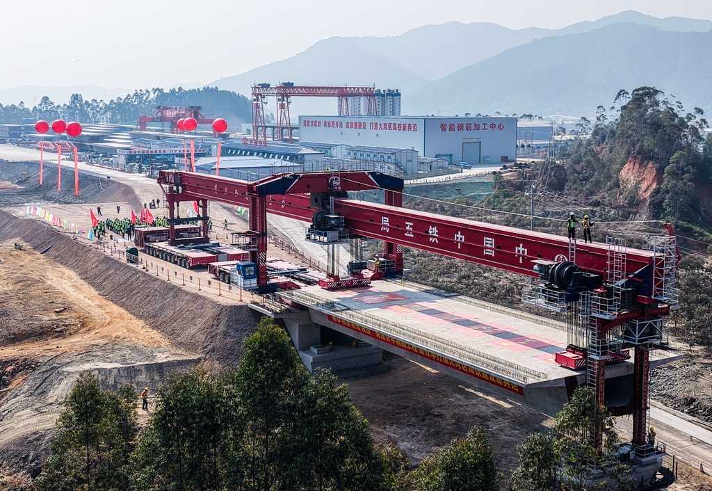 1月21日,珠肇高铁高肇段和珠江段首孔箱梁在肇庆市高要区双金河特大桥桥墩上成功架设。
