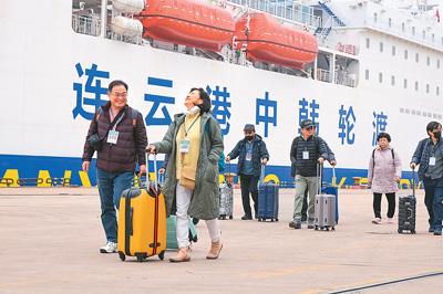 随着中国过境免签政策持续升级和免签“朋友圈”不断扩容,外籍游客来华热情愈发高涨,入境游的高速增长成为今年新春旅游市场一大亮点。图为日前,在江苏连云港港海港客运口岸,下船的韩国游客前往入境大厅。