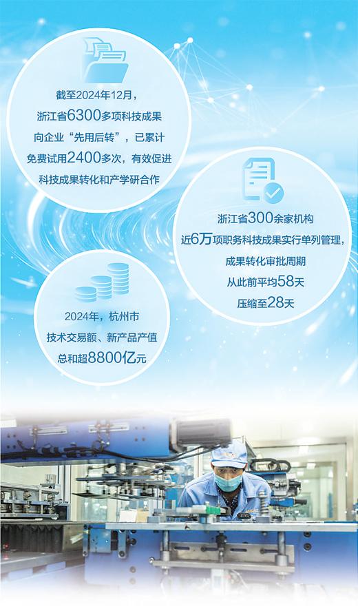 湖州长兴县超威集团牵头高校院所,成立“水系锌离子电池”成果池,供来长兴投资的上下游企业免费使用;丽水龙泉市聚焦汽车空调主导产业,推动相关企业以“先用后转”方式与高校达成产学研合作,联合攻关12个技术难题……截至2024年12月,浙江省有6300多项科技成果向企业“先用后转”,已累计免费试用2400多次,有效促进科技成果转化和产学研合作。