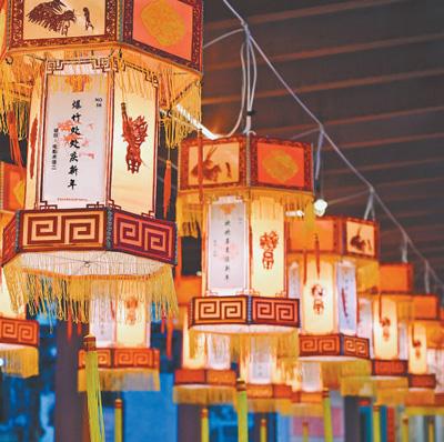 广东汕头市澄海区灯谜文化长廊内,一盏盏写有灯谜的花灯,等待游客观赏解谜。