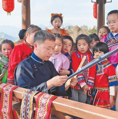 浙江云和县黄处村,非遗代表性传承人正在向孩子们展示非遗技艺。