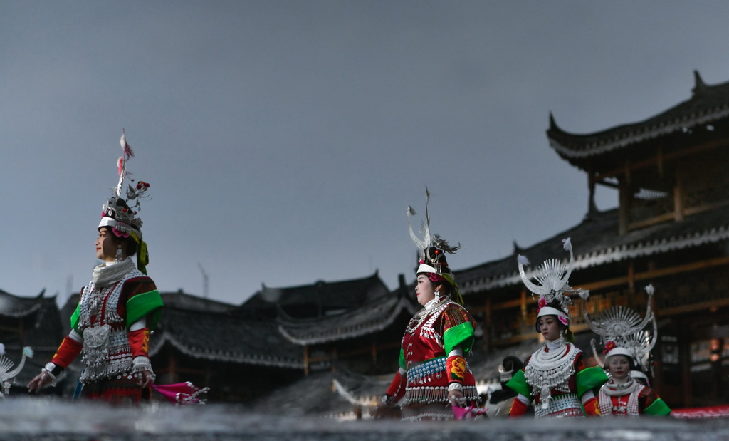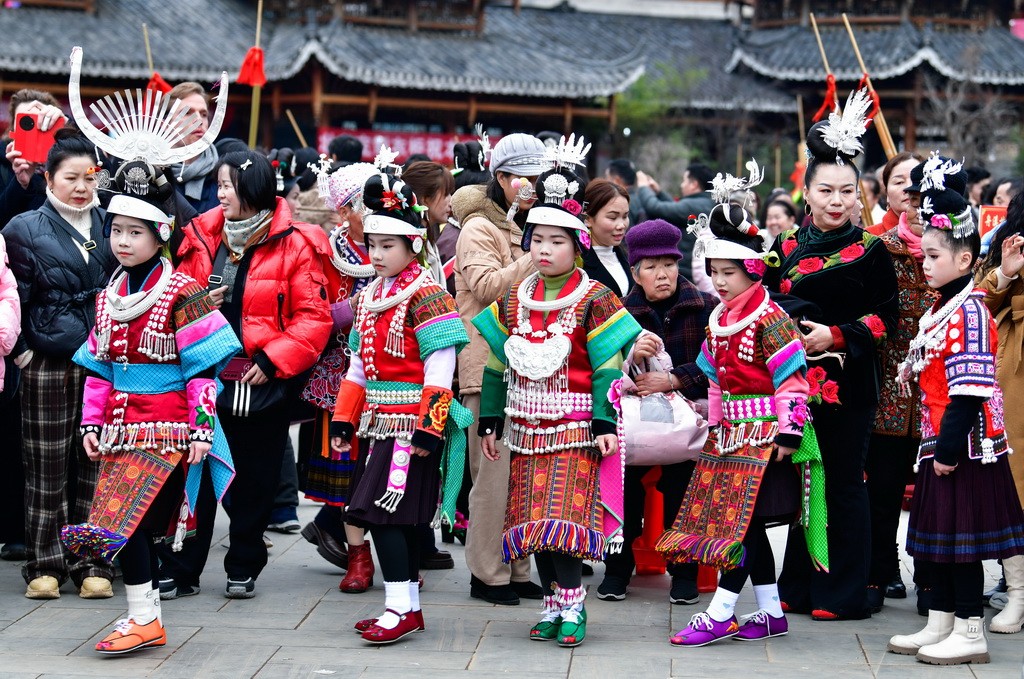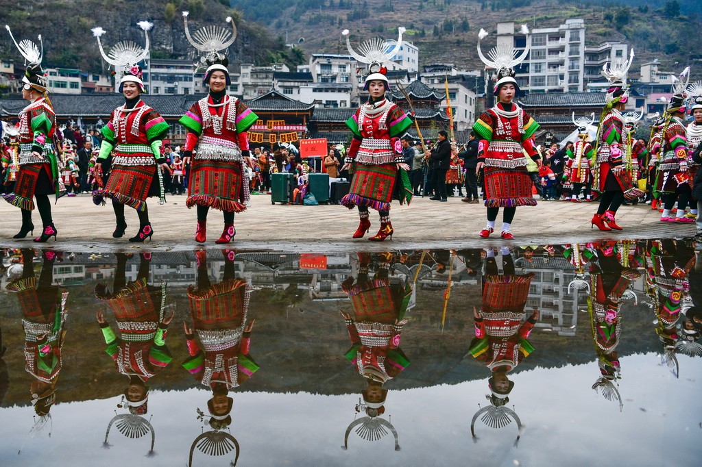 2月15日,在贵州省凯里市舟溪镇“甘囊香”芦笙堂,苗族姑娘身着盛装跳芦笙舞(照片翻转180度)。新华社记者 杨文斌 摄