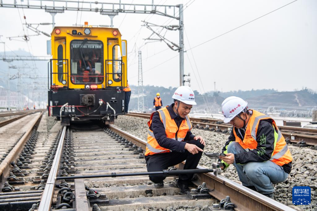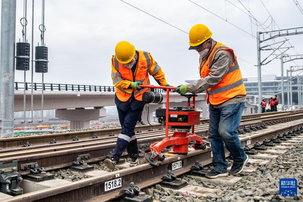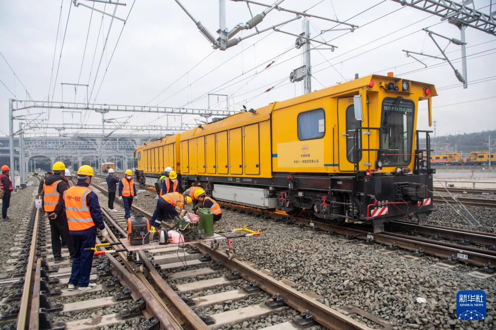 2月18日,在重庆东站建设施工现场,铁路工人在对线路进行精调作业。