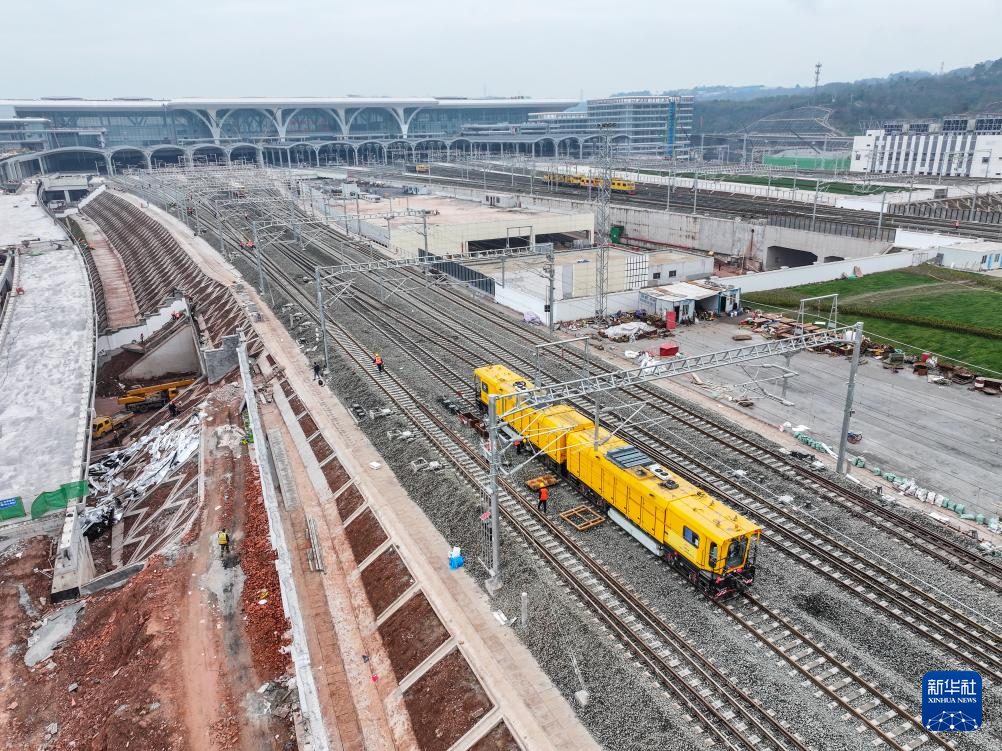 这是2月18日拍摄的重庆东站建设施工现场线路精调作业现场(无人机照片)。