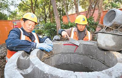 近年来,安徽省合肥市庐阳区积极推进老旧小区改造提升工程,包括污水管网改造、墙体翻新、屋顶防雨、环境绿化等,不断优化人居环境。图为2月16日,在庐阳区海棠街道海棠别院小区,工人在对小区污水管网进行改造施工。