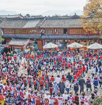 从高处俯瞰,丽江古城并不追求方正规整,城镇布局随形就势,高低错落的屋顶轮廓勾勒出不拘一格的线条。近年来,丽江持续加强文化遗产保护和活化利用,坚持保护第一、修旧如旧,恢复性修缮了具有历史文化保护价值的传统民居299户、院落236个。