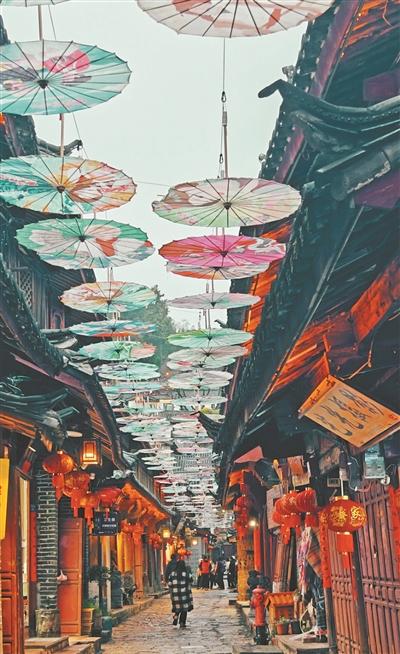 古城中,腊排骨火锅等美食独具特色,普洱茶香气四溢,还有不少游客端着一杯云南小粒咖啡。夜幕降临,四方街迎来了它最迷人的时刻。纳西古乐在街巷中回响,袅袅余音吟咏着往昔的岁月。不远处的广场上,民谣悠扬,吉他声与歌声一道,讲述着丽江古城今天的故事。