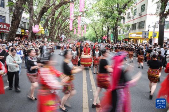 当日,2025海南黎族苗族传统节日“三月三”主会场活动在海南五指山市举行。当地举办了形式多样的民俗活动庆祝佳节,游客可以在五指山市观看“村秀”、竹竿舞等表演,还可以体验长桌宴特色美食。
