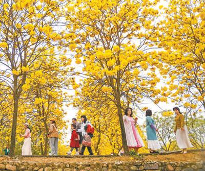 4月5日,游客在广西壮族自治区桂林市临桂区会仙镇岭上村赏花游玩。