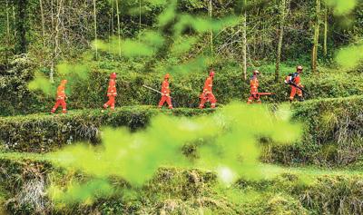 4月5日,江西省宜春市袁州区柏木乡半专业森林消防队队员在重点林区进行防灭火巡查。
