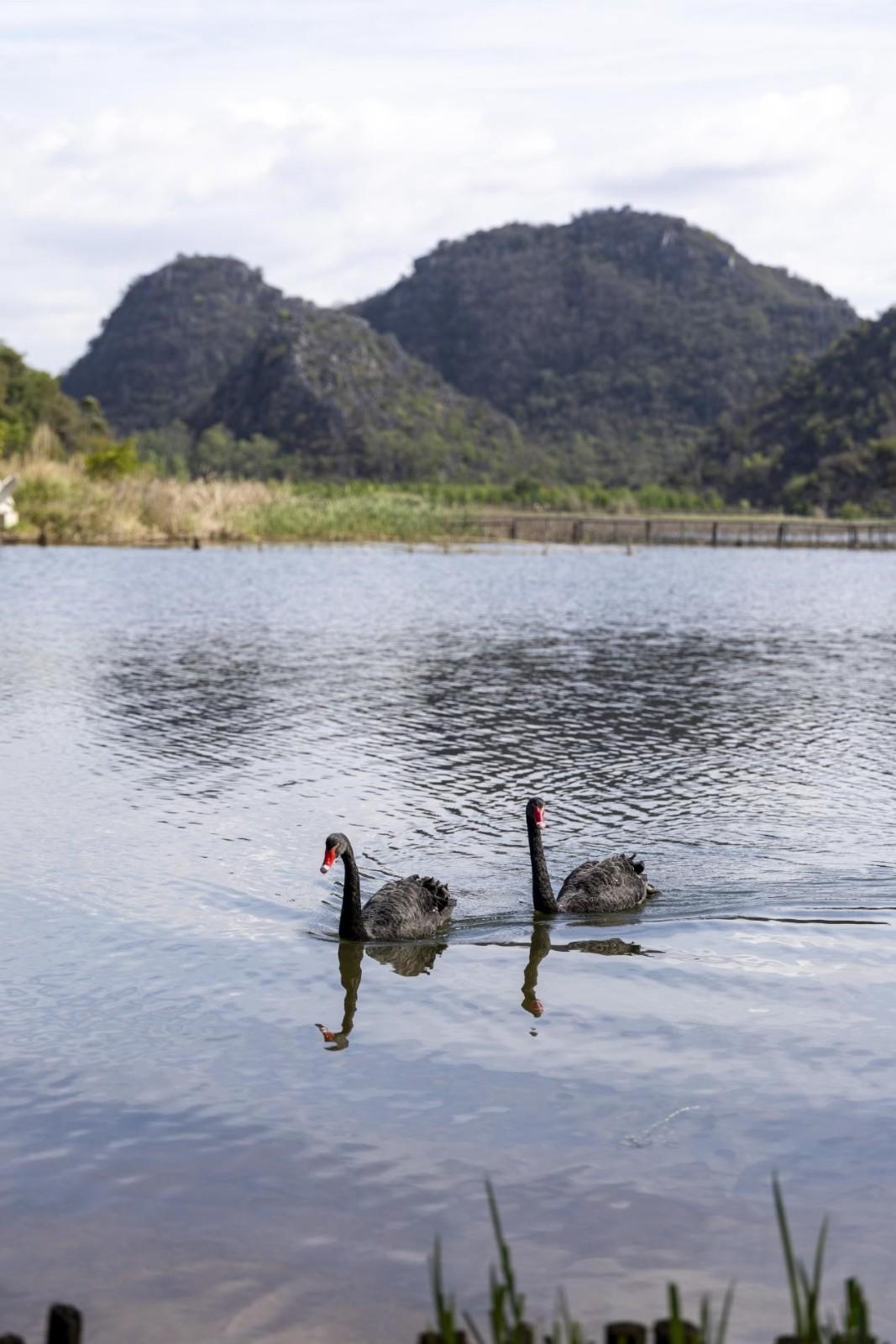 游弋于普者黑天鹅湖中的黑天鹅。王剑 摄