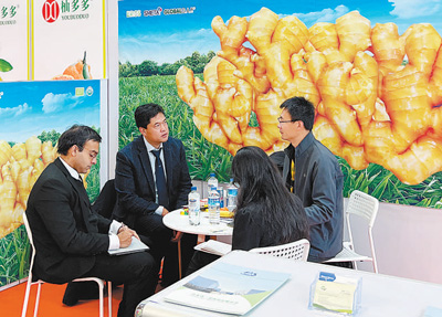 在2025年德国柏林国际果蔬展览会上,山东省三慧食品有限公司工作人员向当地客商推介安丘大姜。