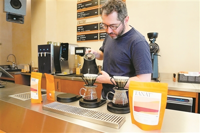 法国知名精品咖啡烘焙品牌TANAT今年推出两款产自云南保山红龙庄园的小粒咖啡产品。该品牌首席烘焙师托马·克莱芒表示,所选的云南咖啡豆口感柔和细腻,兼具丰富的层次与地域特色。图为该品牌位于巴黎的一家门店内,咖啡师在冲泡云南咖啡。