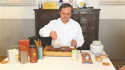 品茶已经成为许多意大利人的日常生活习惯。意大利茶业与花草茶协会主席马可·贝托纳十分喜爱中国茶,并收藏有正山小种、普洱茶等多种中国名茶。图为马可·贝托纳在展示茶艺。