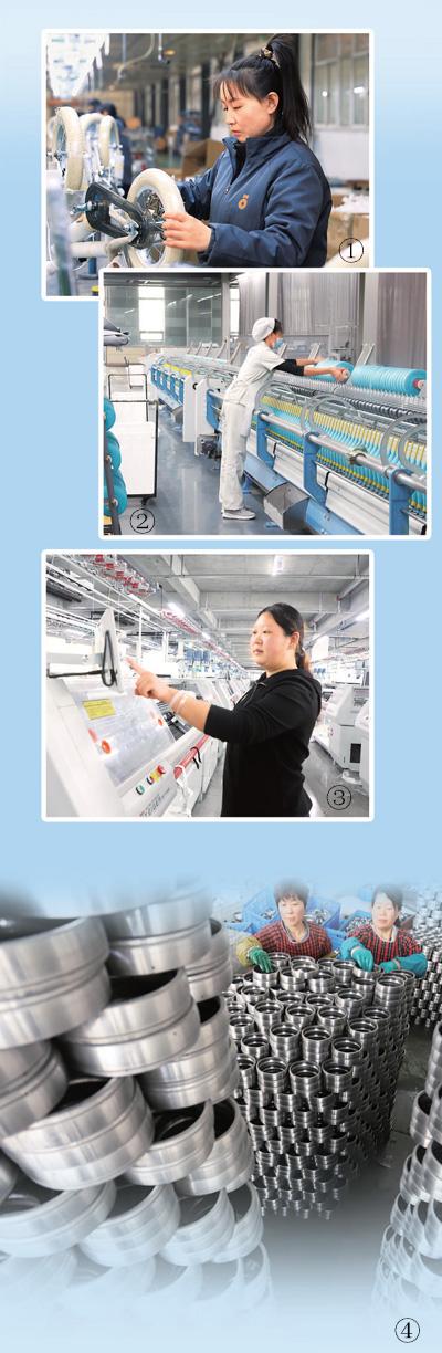 图①:位于邢台市平乡县的邢台金天儿童用品有限公司车间内,工人正在组装童车。