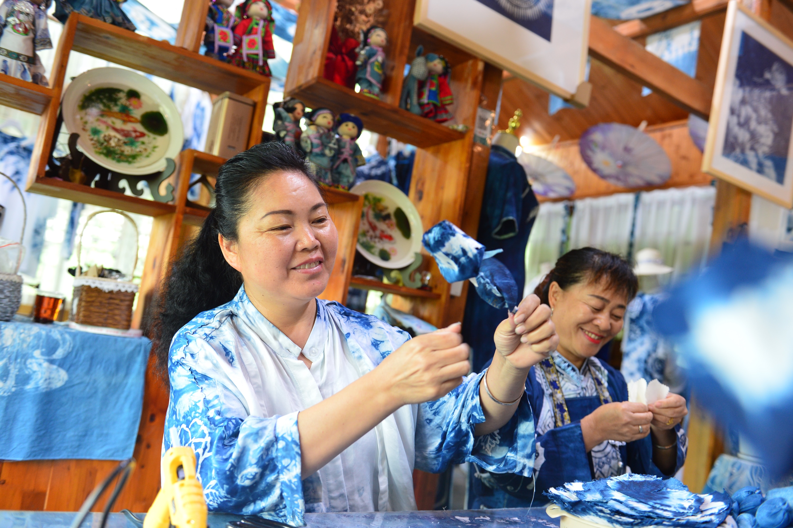 手艺人贾流苹在贵阳市乌当区偏坡村里制作扎染作品。陈斌 摄