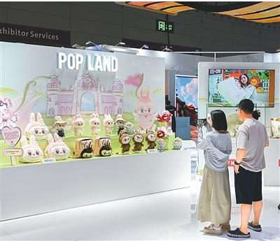 图为5月24日,在第二十一届中国(深圳)国际文化产业博览交易会北京展区,观众在泡泡玛特城市乐园展台前拍照。