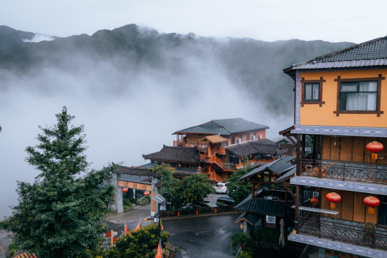云雾缭绕的石椅羌寨,当地许多村民创业吃起了“旅游饭”。邱活摄