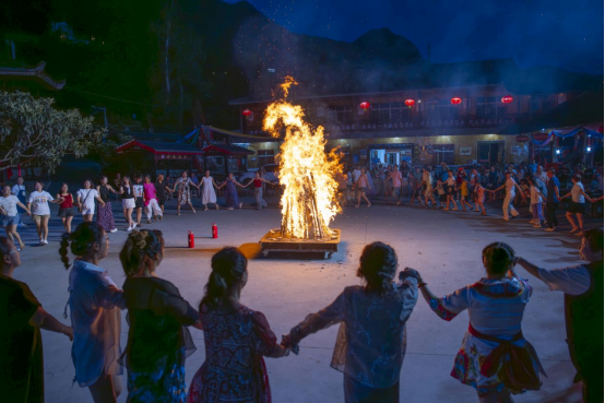 天色微暗,古老的寨门前,游客与羌族村民举起火把,伴随着羌语祝酒歌,踏着羌族特色的沙朗舞步,来到广场中央。当跃动的火种触及柴堆,“轰”的一声烈焰升腾,篝火将四周映得通亮。人们手挽着手载歌载舞,围着篝火旋转、俯仰……